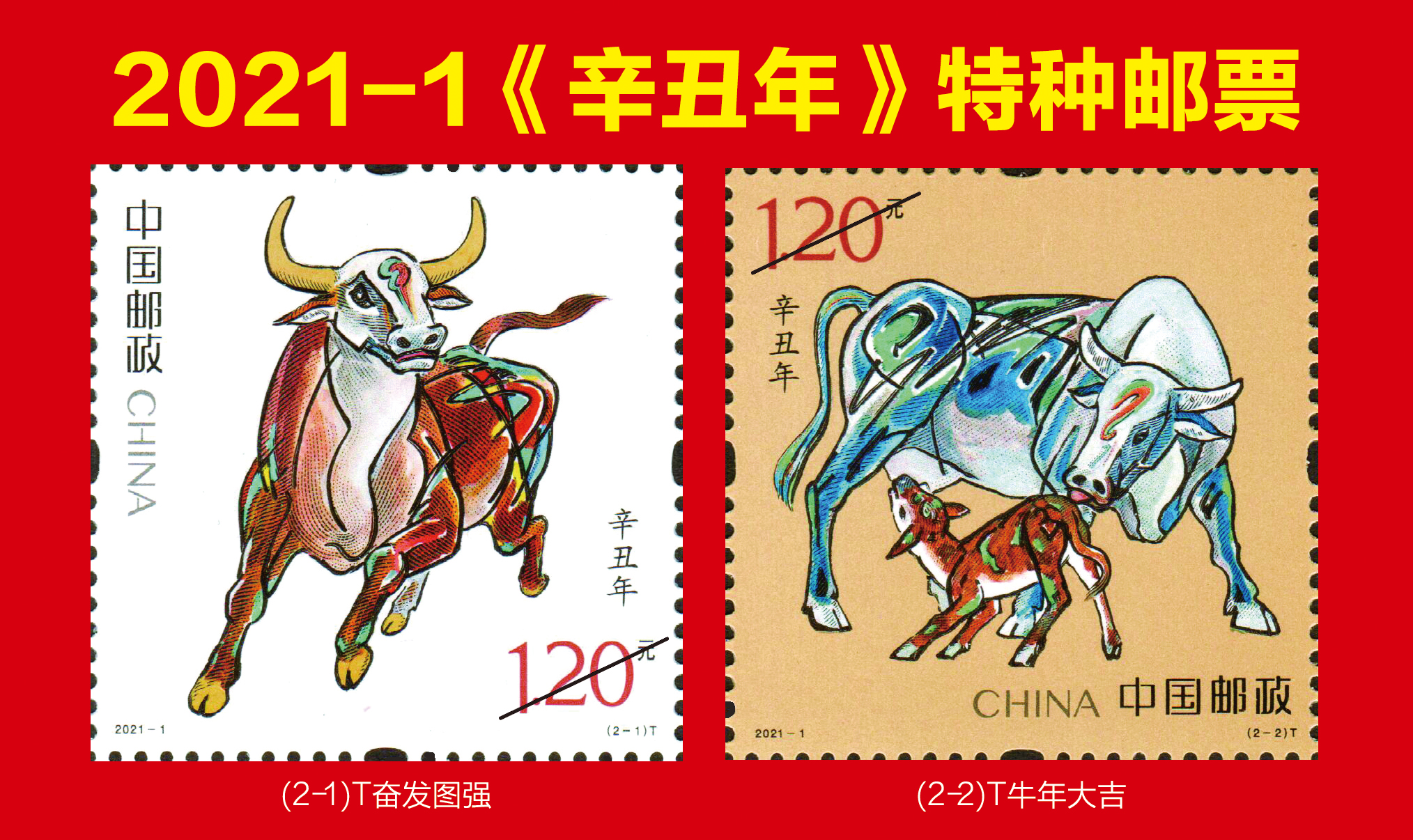 1月5日,中国邮政将发行《辛丑年》特种邮票一套两枚,邮票图案名称分别为:奋发图强、牛年大吉,全套邮票面值为2.40元。