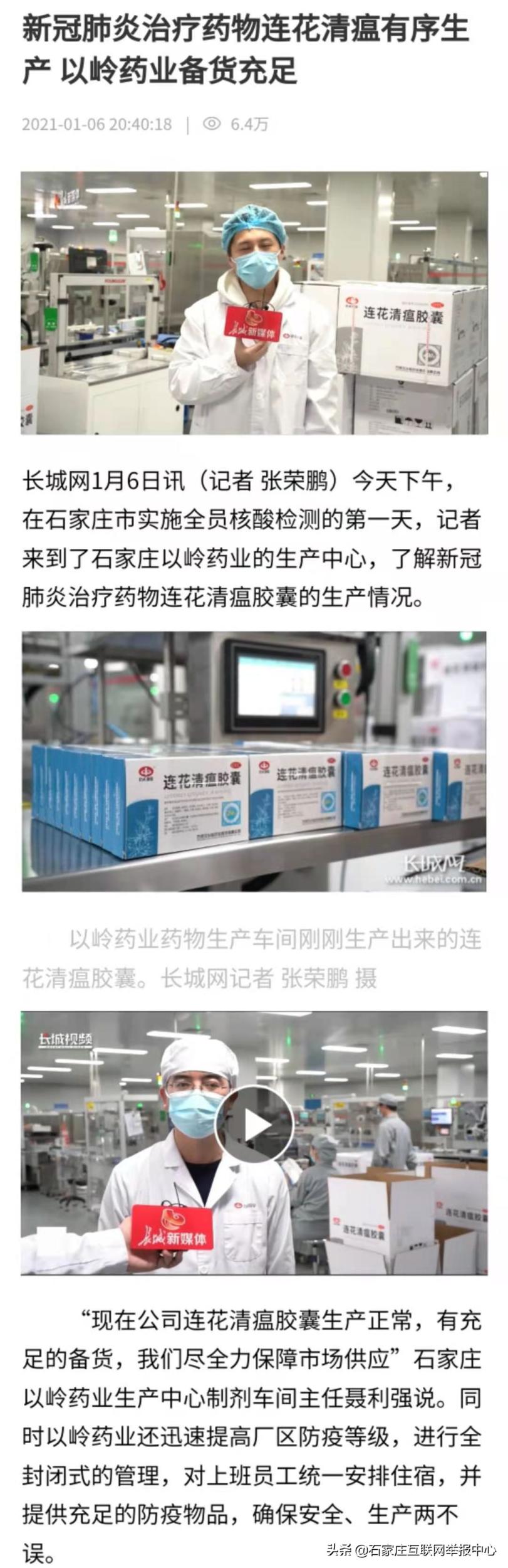 【连花清瘟库存告急?谣言!】近日,网传“以岭药业紧急通知”,称“石家庄市政府要求企业停工停产” “目前连花清瘟库存告急”。6日,长城网记者在石家庄以岭药业生产中心实地了解情况,石家庄以岭药业生产中心制剂车间主任表示,目前连花清瘟胶囊生产正常,备货充足,全力保障市场供应。请广大网民不传谣、不信谣,石家庄疫情防控工作正在社会各界共同努力下有力推进,让我们共同努力,战胜疫情!#石家庄身边事# #微博辟谣##石家庄辟谣#