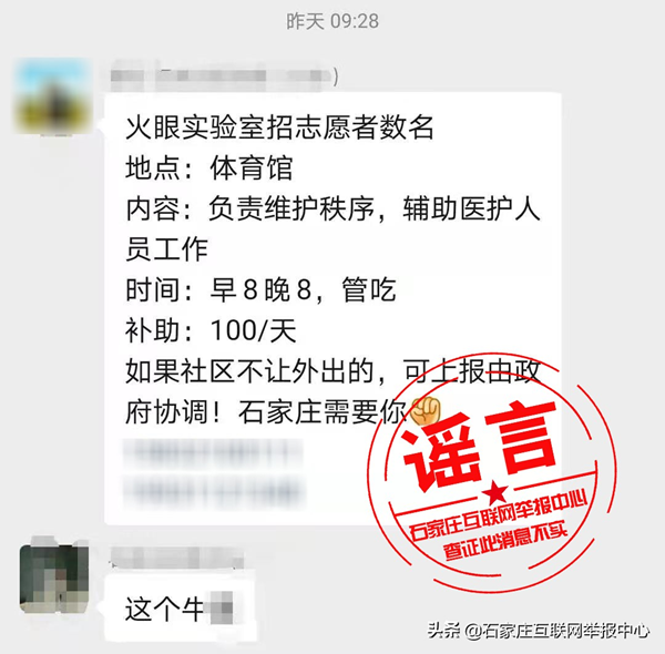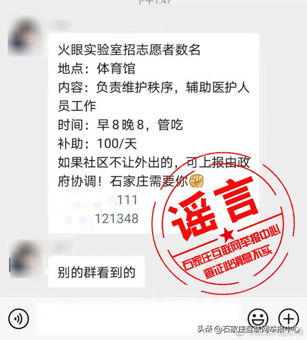 近日,网络流传“河北‘火眼’实验室招聘数名志愿者,负责维护秩序,辅助医护人员工作,管吃还每天补贴100元”的信息。经石家庄互联网举报中心向河北“火眼”实验室相关工作人员核实,该消息为谣言,目前河北“火眼”实验室还没有招聘志愿者计划。石家庄互联网举报中心:提醒广大网民,疫情期间,一些消息难辨真假,请以官方消息为准,谨慎辨别,防止爱心被利用,造成不必要损失。#河北辟谣##石家庄身边事#