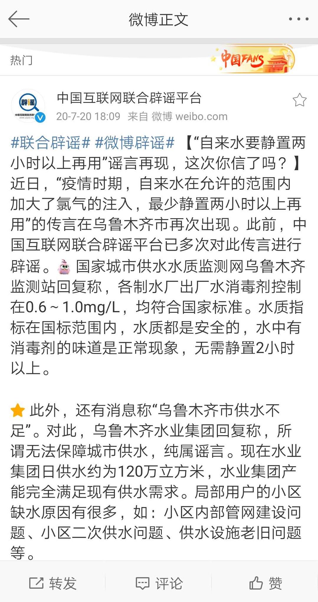 图为中国互联网联合辟谣平台官方微博辟谣“自来水要静置两小时以上再用”。