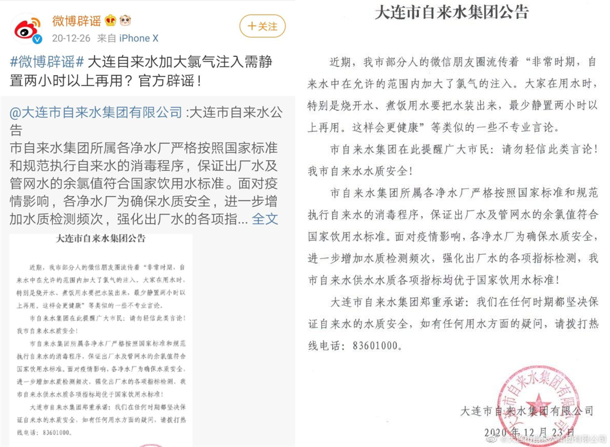 图为大连自来水集团辟谣公告。