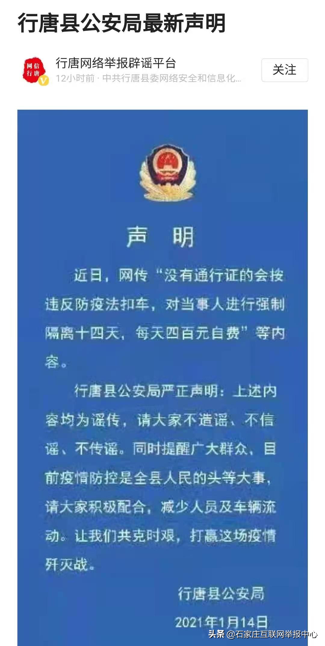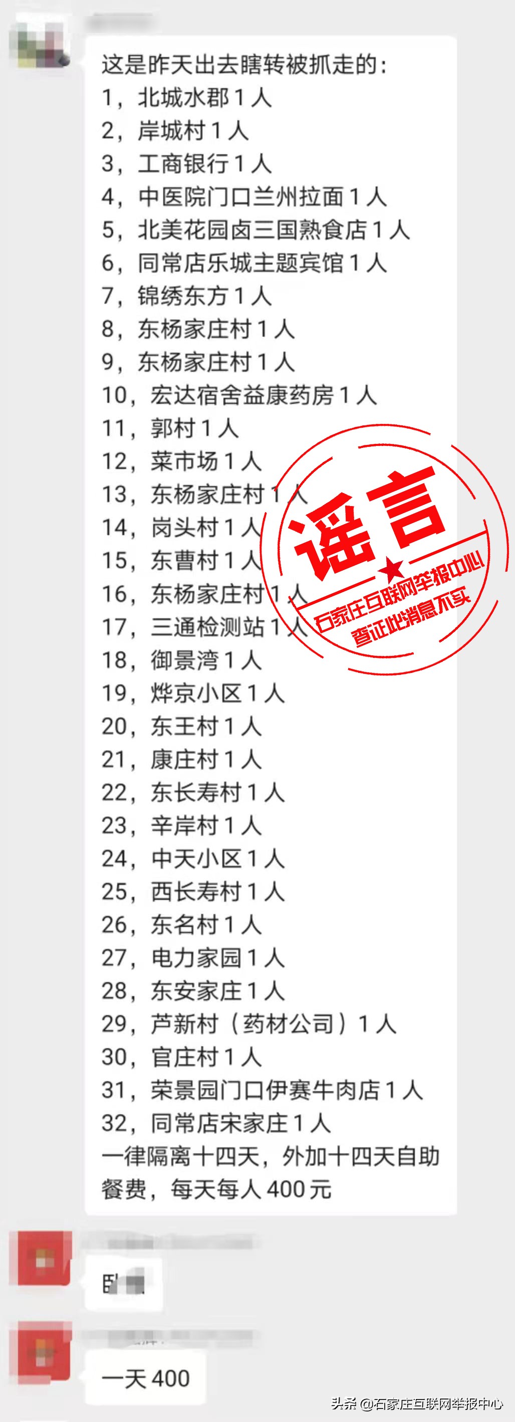 近日,微信群、朋友圈流传着一则石家庄某地“出去瞎转的一律被抓走,隔离十四天,每天每人四百元”的消息。石家庄互联网举报中心根据消息显示的村庄和小区,向新乐市相关部门核实,证实该消息为谣言。据检索,此前网传谣言还有“交警上路查车,无通行证的扣车、隔离十四天”等版本,石家庄市平山县、行唐县等多地已辟谣。