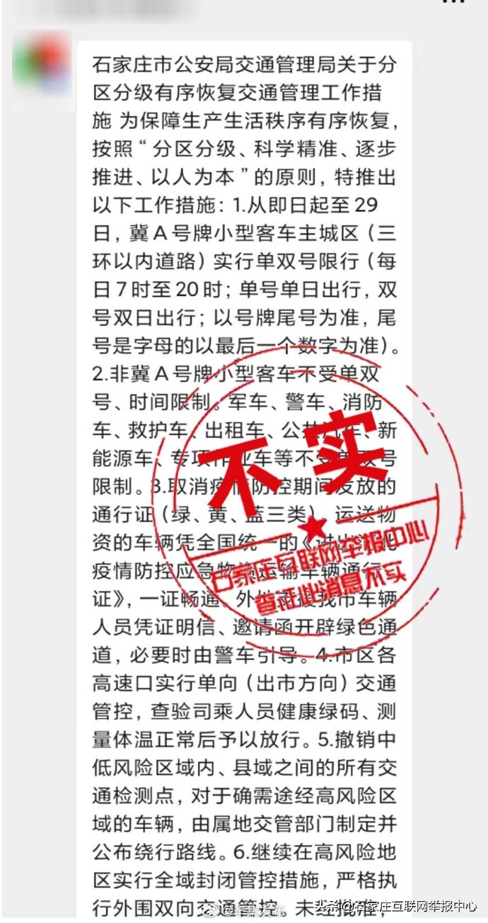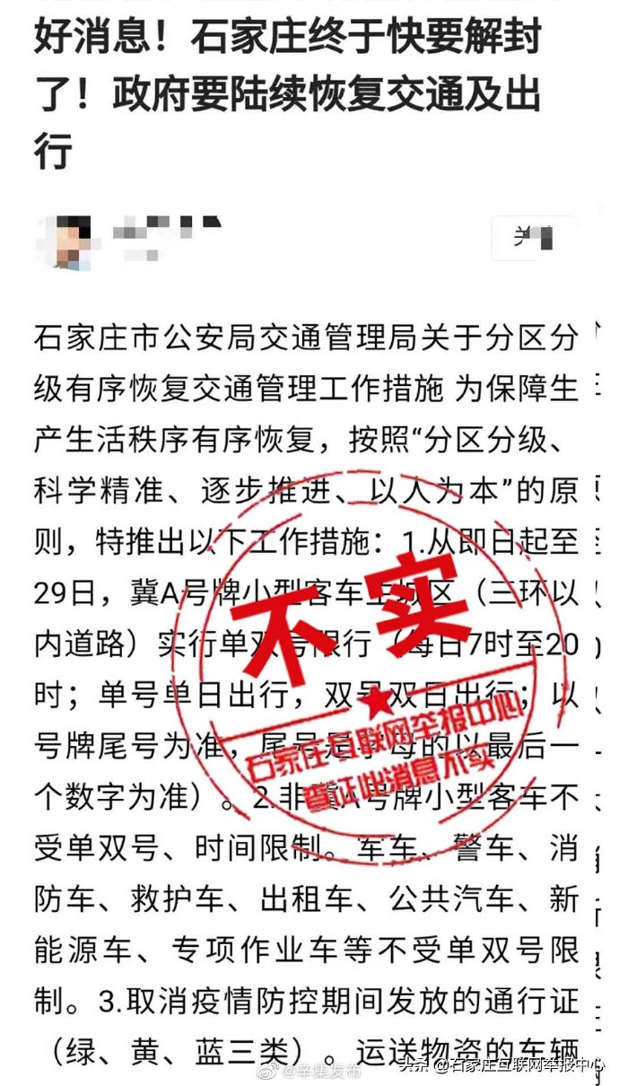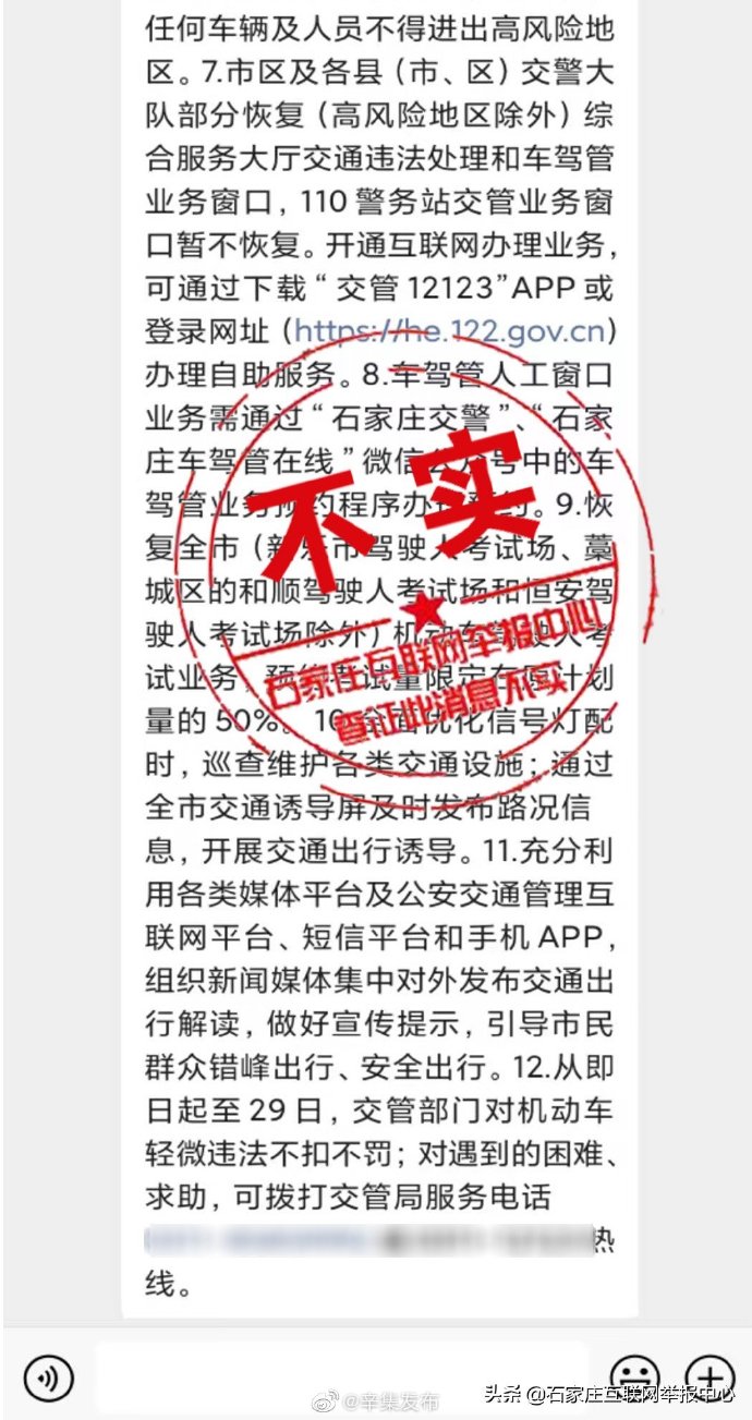 #网络谣言粉碎机# 【网传“石家庄市交管局通知陆续恢复交通及出行”,官方回应:不实!】近日,有网民在微信朋友圈、今日头条发布主题为“石家庄市公安局交通管理局关于分区分级有序恢复交通管理工作措施”的消息,内容包含十余条具体“举措”,甚至明确了各类车辆出行要求。经石家庄互联网举报中心向市公安局交管部门核实,截至目前,交管部门未发布相关信息,网传信息不实,如有新的交管防控措施将及时向社会公布。