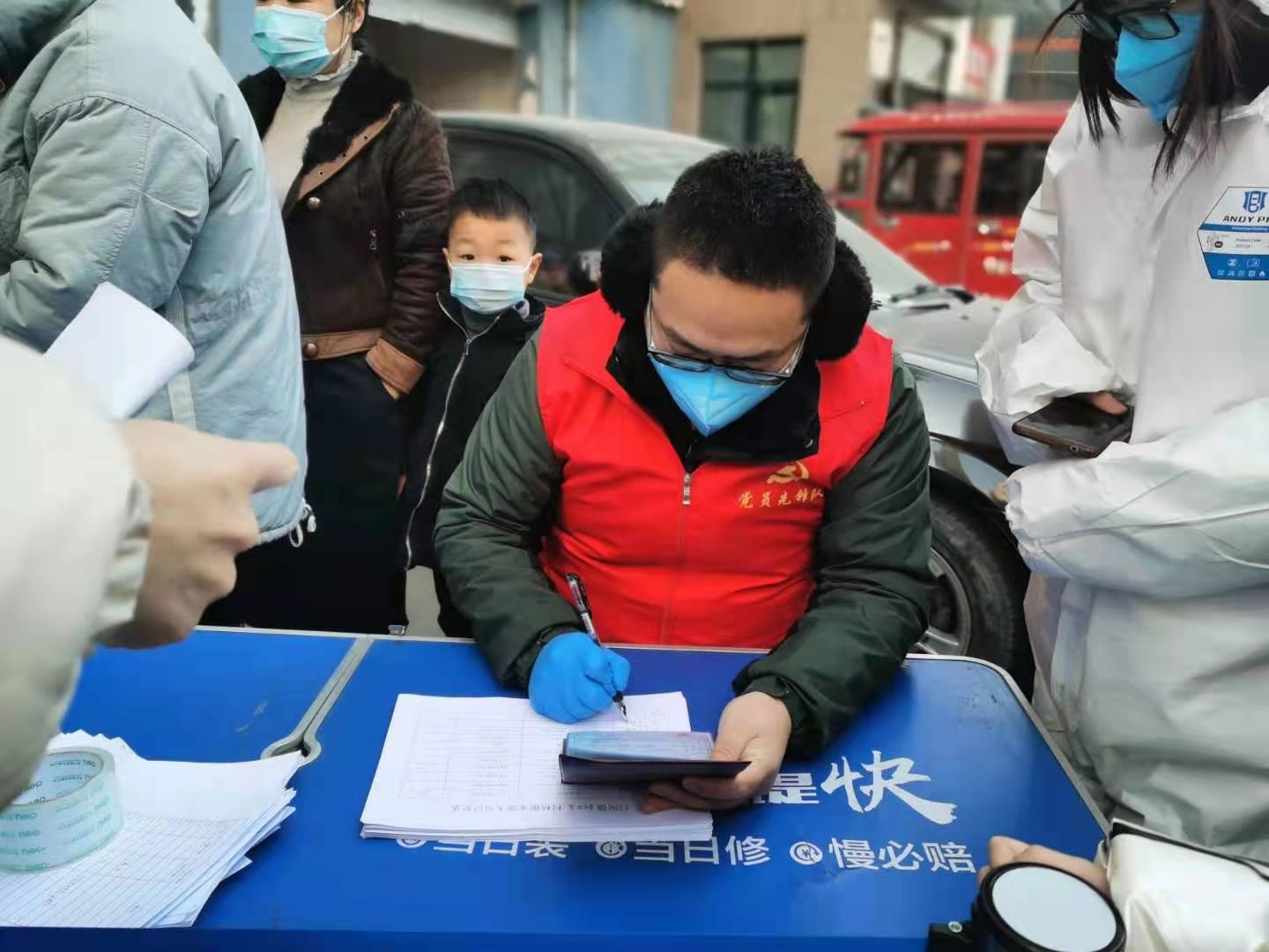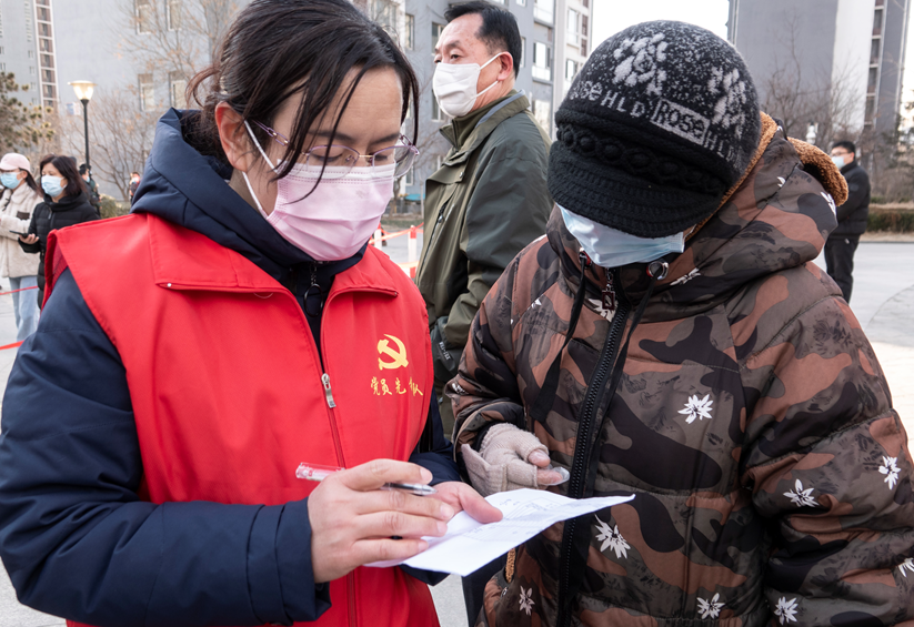 “请大家戴好口罩,间隔一米排好队,按顺序验码登记……”在我市秀兰尚城小区核酸检测点,电信客户运营部党支部的志愿者们维持现场秩序,一身“党员先锋队”红马甲格外亮眼。支部书记杨明霞向社区书记主动请缨,负责个人信息采集即验码环节,支部党员、入党积极分子纷纷踊跃报名参与志愿服务。室外气温低,志愿者们不畏严寒、坚守一线,保障核酸检测工作有序进行。