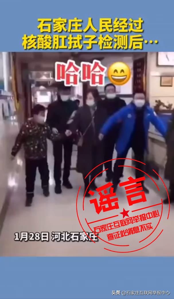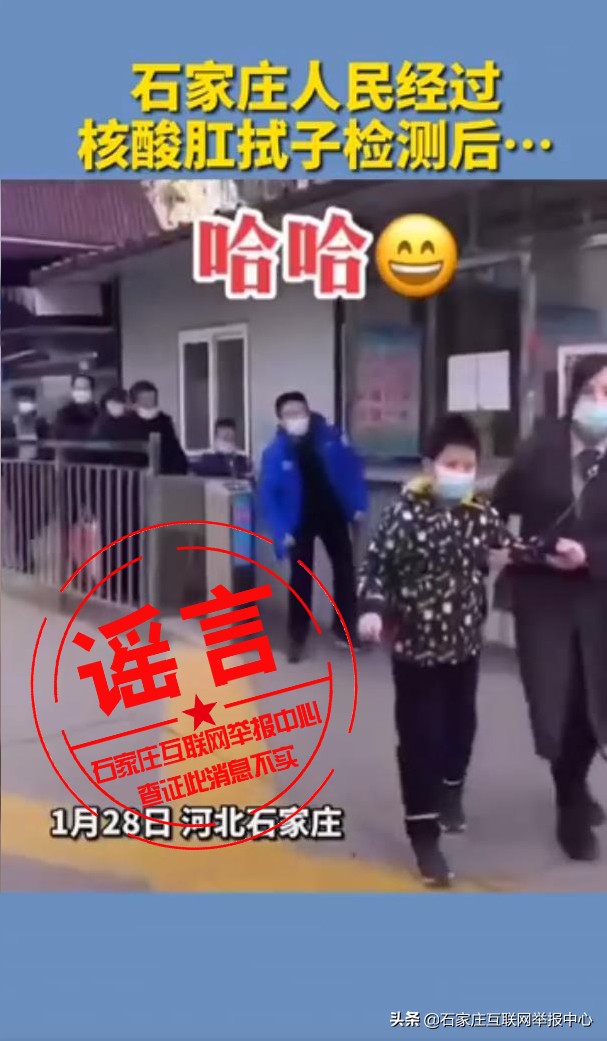 近日,一则“石家庄市民经过肛拭子核酸检测后秒变企鹅,走路姿势变成了外八字”的视频在各大网络平台广泛传播。经石家庄互联网举报中心向市卫健部门和市新冠肺炎救治专家组成员市第五医院王海滨主任医师核实,网传消息为移花接木式谣言,石家庄自2021年发生疫情以来,各社区采集标本均为口咽或鼻咽拭子,各社区从未采集过肛拭子,肛拭子标本只对住院并发腹泻的新冠肺炎患者进行采集,且肛拭子采集后无明显不适。