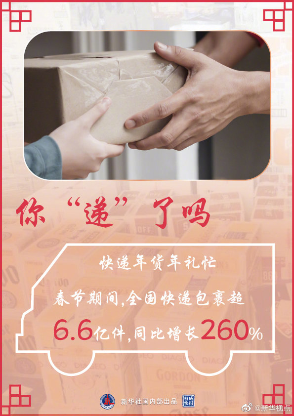 国家邮政局快递大数据平台监测显示,春节期间(2月11日至17日),全国邮政快递业累计揽收和投递快递包裹6.6亿件,同比增长260%。