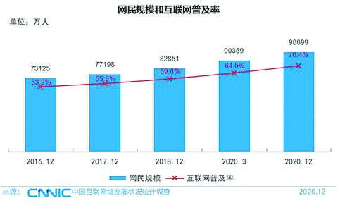 《报告》提供的数据显示,截至2020年12月,我国网民规模达9.89亿,较2020年3月增长8540万,互联网普及率达70.4%,较2020年3月提升5.9个百分点。其中,手机网民规模达9.86亿,较2020年3月增长8885万,网民使用手机上网的比例达99.7%。