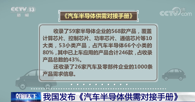 《汽车半导体供需对接手册》收录了59家半导体企业的568款产品,覆盖计算芯片、控制芯片、功率芯片、通信芯片等10大类,53小类产品,占汽车半导体66个小类的80%,其中已上车应用的产品合计246款,占收录产品总数的43%。《手册》还收录了26家汽车及零部件企业的1000条产品需求信息。