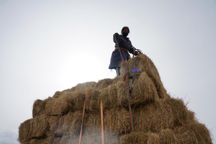 在青海省果洛藏族自治州甘德县江千乡,村民正在给刚收割完的饲草打捆。(2020年11月3日摄)。新华社记者陈凯 摄