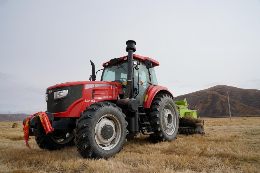 在青海省果洛藏族自治州甘德县江千乡,一位牧民正在饲草基地驾驶打捆机工作。(2020年11月3日摄)。新华社记者陈凯 摄