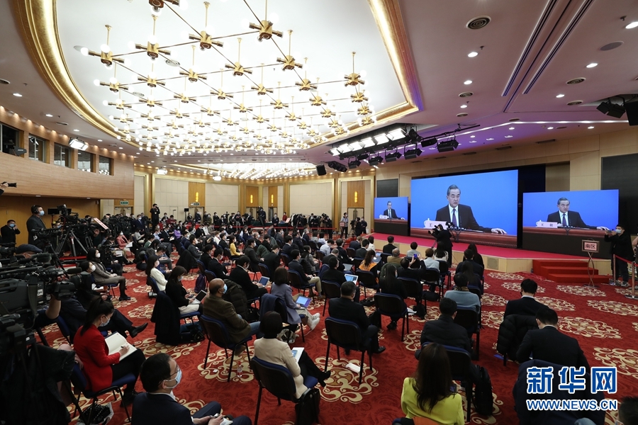3月7日,十三届全国人大四次会议在北京人民大会堂新闻发布厅举行记者会,邀请国务委员兼外交部长王毅就“中国外交政策和对外关系”相关问题回答中外记者提问。为有效防控疫情,共同维护公共卫生与健康,记者会采用网络视频形式进行。这是记者在梅地亚中心多功能厅采访。 新华社记者 金立旺 摄