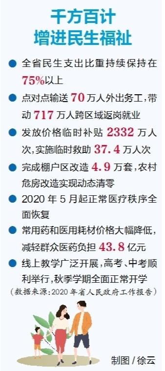 看医疗卫生——疫情之下,满足群众就医需求是重大考验。全省推行远程医疗、预约诊疗,扩大基本医保跨省异地就医住院费用直接结算范围。实施“双分诊、双缓冲”,去年5月起正常医疗秩序全面恢复。常用药和医用耗材价格大幅降低,减轻群众医药负担43.8亿元。