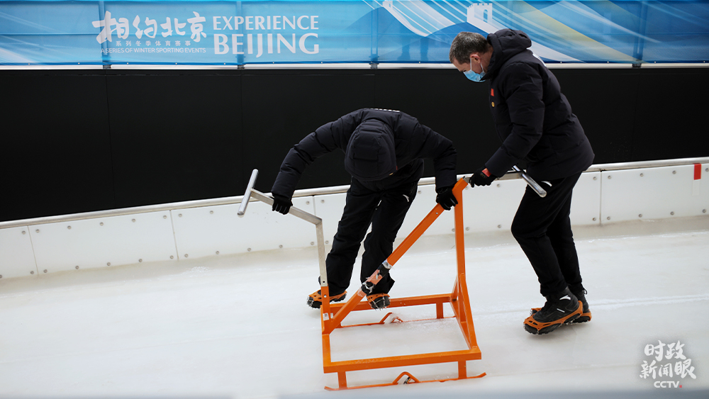 △延庆赛区雪车雪橇中心,教练为雪车训练切割出发槽。(总台央视记者王哈男拍摄)
