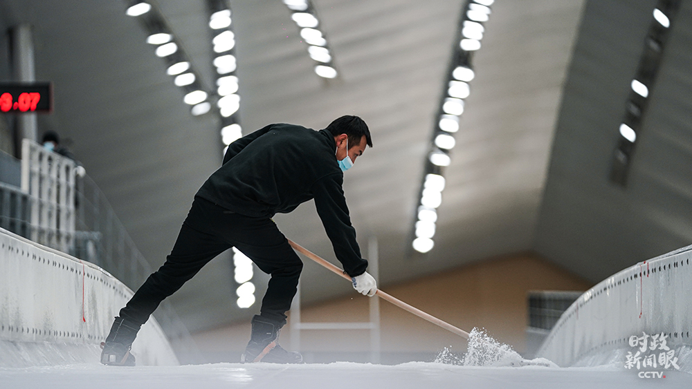 △国家雪车雪橇中心,制冰师对赛道冰面做精细修整。(总台国广记者李晋拍摄)