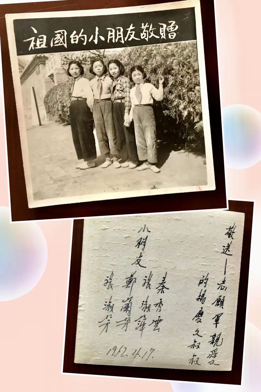 杨庆久老人的相册里珍藏着一张老照片,照片上是4个戴红领巾的小女孩。照片的最上面写着“祖国的小朋友敬赠”,照片背面的最右边写着“敬送志愿军亲爱的杨庆久叔叔”。左边依次写着4个小朋友的名字,分别是秦秀云、张淑萍、郑兰芳、张淑芳。时间显示为1952年4月17日。