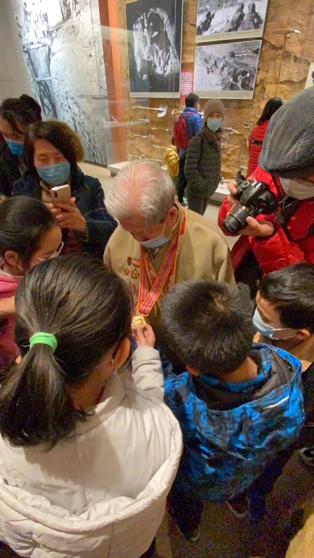 看到杨庆久老人胸前挂着的解放东北、解放华中南、抗美援朝的纪念章,很多小朋友围在他身边,摸着纪念章问:“爷爷,您是英雄吗?”“爷爷,您真棒!”老人满心欢喜,和孩子们讲了一件又一件往事。