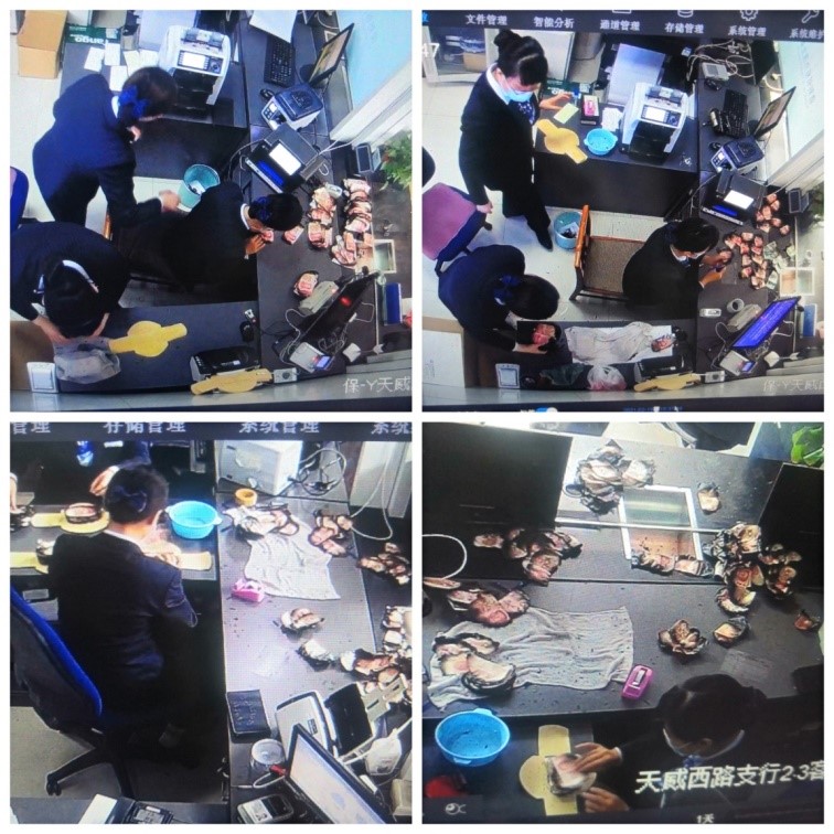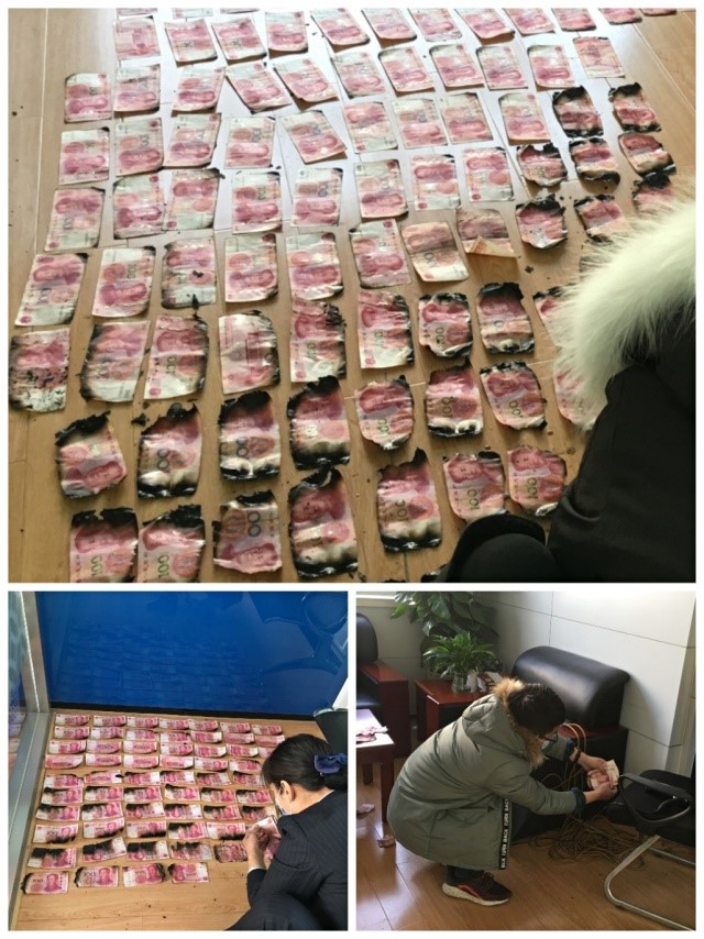 该行营业室负责人在确保安全和经过客户同意的前提下,安排专人在VIP相对封闭区域为客户整点,清点柜员首先帮助客户将残破币一张张揭开,平铺在地板上,用吹风机一张张的吹干,又一张张的比对,其中有少量可以全额兑换,相当部分需凭借高度的专业及耐心比对标尺一格一格点数才能够兑换半额。柜员的手上也因清点而变黑,但他们丝毫不受影响,全情投入,克服无法充分将残破币充分铺开的困难,尽最大可能兑付相应币值,确保客户利益不受更大损失。
