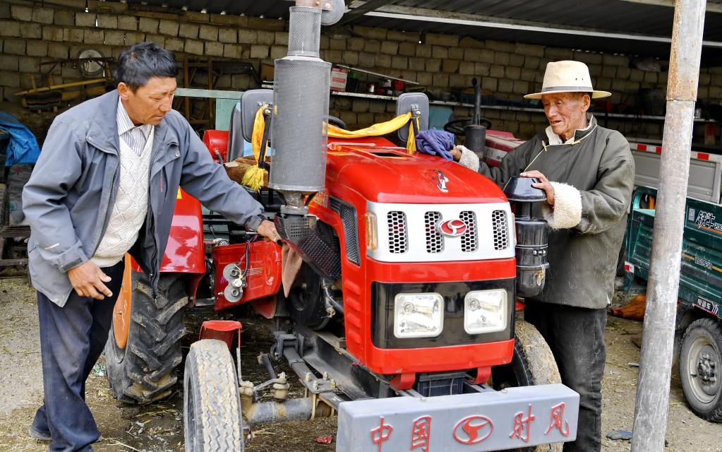 翻身农奴多扎木老人(右一)在和儿子加央(左一)擦拭拖拉机。(新华社记者张汝锋 摄)