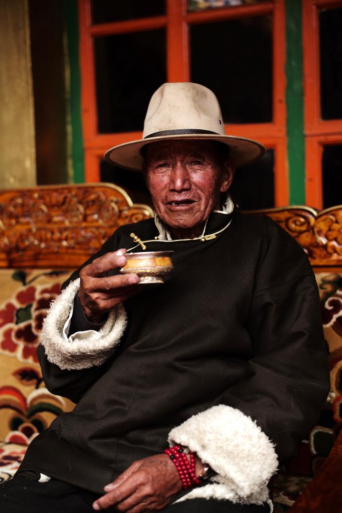 翻身农奴多扎木老人在喝甜茶。(新华社记者孙瑞博 摄)