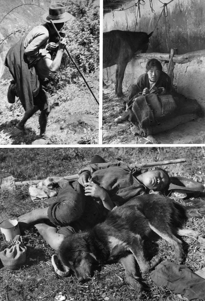 上图左:西藏农奴制度下的“人背人”(即农奴背驮农奴主)差役。上图右:和牲口同住的农奴。下图:农奴益西钦沛服劳役后与犬同眠。(新华社发)