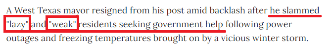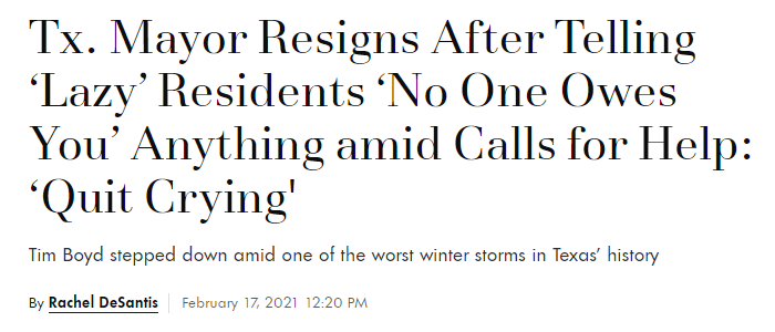 然而,该市市长蒂姆·博伊德2月16日却在社交媒体发文将政府的责任推卸得一干二净,并攻击部分民众“又懒又弱”。