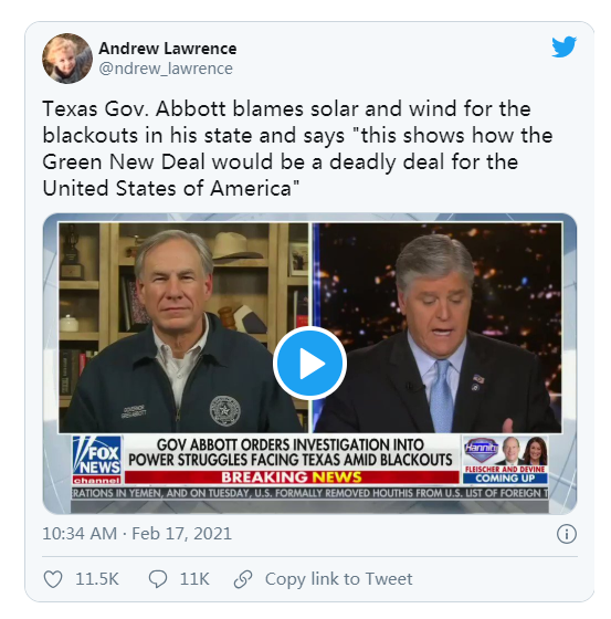 得克萨斯州州长格雷格·阿博特在接受采访时,把停电之锅甩给了“绿色新政”。