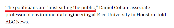 休斯敦莱斯大学环境工程专业副教授丹尼尔·科汉直言,政客们是在“误导公众”。