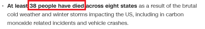 据美国有线电视新闻网(CNN)报道,截至当地时间2月18日,冬季风暴已造成全美至少38人死亡,数百万家庭和商户遭遇持续停电,水和燃料供应也受到很大影响。在受灾最严重的得克萨斯州,数十万民众已经连续四天断电。