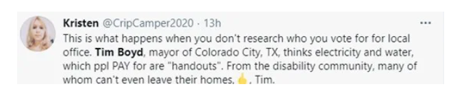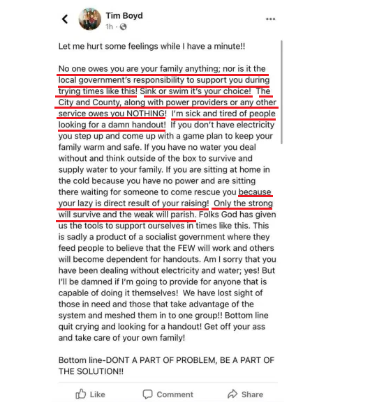 博伊德在社交媒体上说:“我们不欠你和你的家庭什么,当地政府的责任不是在这种困难的时候给你们提供帮助!生存还是死亡是你们自己的选择!政府和电力供应商以及其他服务供应商并不欠你们什么!”