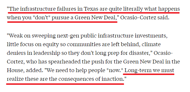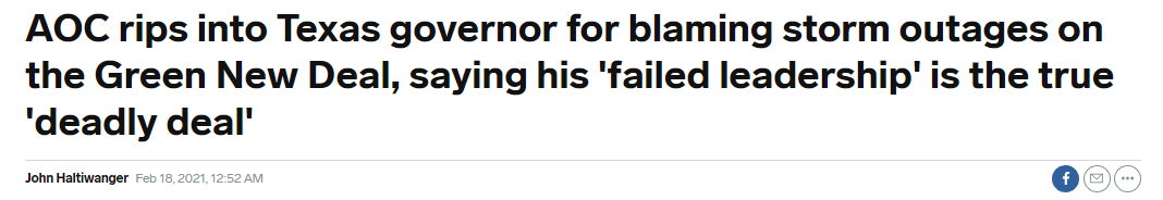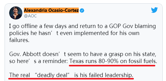 这一甩锅行为马上遭到了国会众议员、有“推动绿色新政先锋”之称的亚历山德里亚·奥卡西奥-科尔特斯的批评——“得州80%-90%的能源都来自化石燃料,真正的‘致命政策’是阿博特州长失败的领导。”