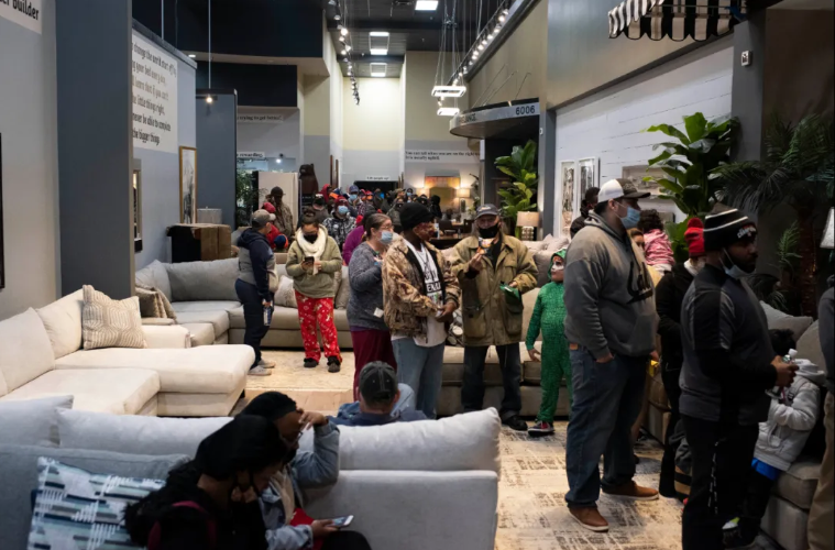 当地时间2月17日,因遭遇停水停电,得克萨斯州民众在家具店排队等待领取食物。