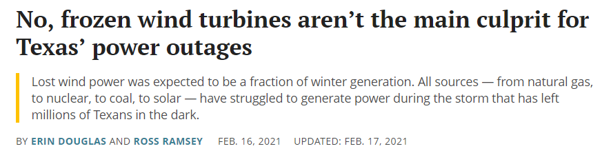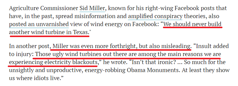 得州农业委员会委员席德·米勒也“毫不犹豫”地抓住这次机会诋毁风能,提出“我们永远不应该在得州再建一座风力涡轮机”。他还在另一篇文章中发表更具误导性的言论说,“那些丑陋的风力涡轮机是我们遭遇停电的主要原因之一”。