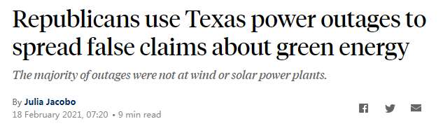 美国广播公司(ABC)的报道则认为,共和党政客们正利用得州大范围停电来错误地指责可再生能源,但它们并不是罪魁祸首。