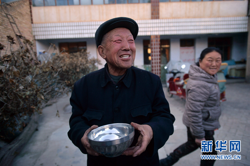 引洮工程一期试通水,甘肃省定西市内官营镇内官村农民李炳章用碗盛出干净透彻的自来水。(新华社记者范培珅2014年12月28日摄)