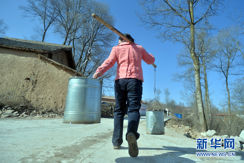 甘肃省渭源县田家河乡元古堆村的村民在引洮工程一期的自来水还未到达家中之前从村里唯一的水源往家里担水。(新华社记者范培珅2014年12月28日摄)
