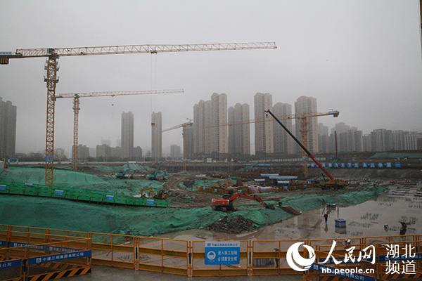 雨中不停工的湖北省人民医院洪山院区工地。人民网 郭婷婷摄