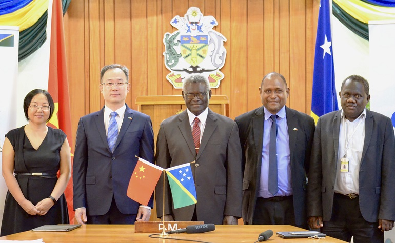 △中国驻所罗门群岛大使李明(左一)和所罗门群岛总理索加瓦雷(中)