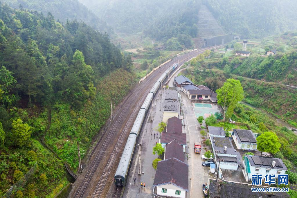 4月11日,7266次列车驶出湖南湘西土家族苗族自治州古丈县默戎镇境内的万岩站(无人机照片)。