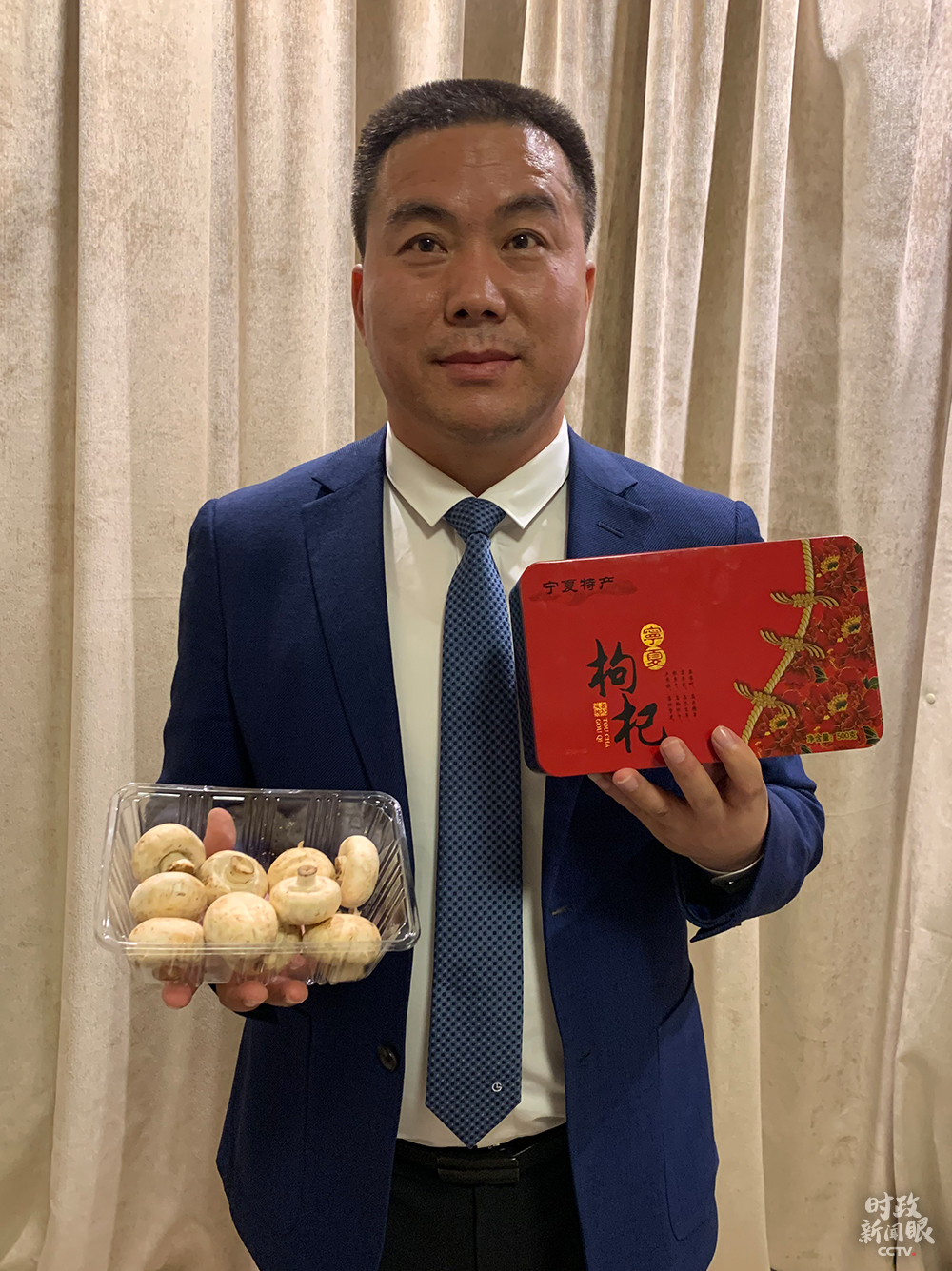△闽宁镇党委书记张文带来家乡特产蘑菇、枸杞。(总台央视记者范一鸣拍摄)
