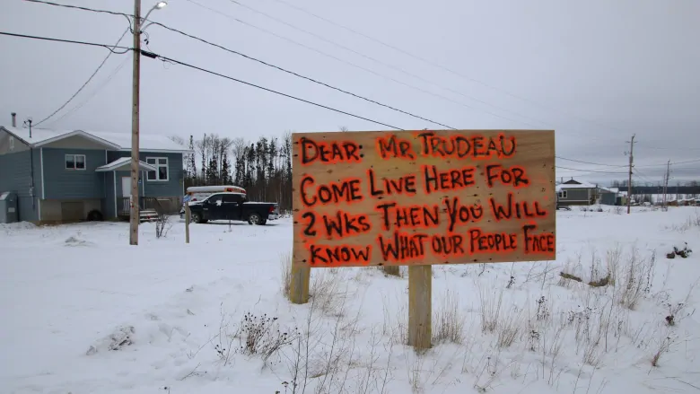 △第一民族保留区树立的牌子,上面的文字是“亲爱的特鲁多先生,来这里生活两个星期,你才能知道我们面临什么问题”