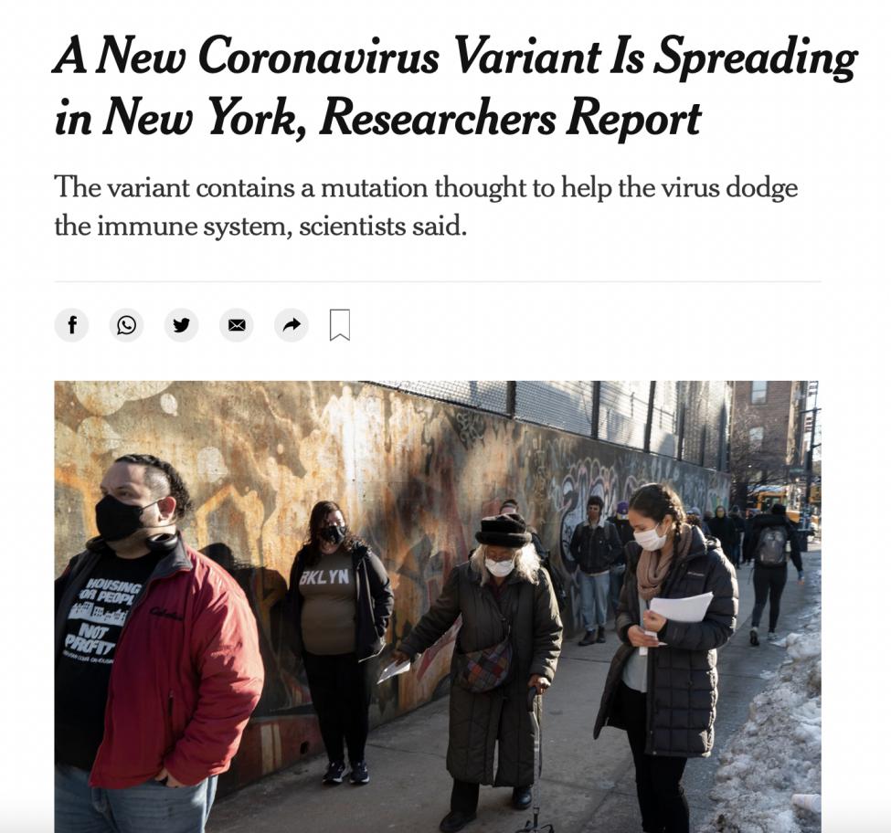 △《纽约时报》报道,研究人员报告称,一种新的冠状病毒变种正在纽约市传播
