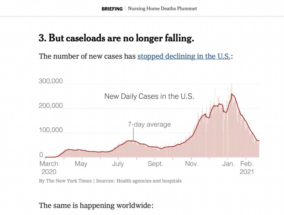 《纽约时报》称,最新数据显示,美国新冠肺炎新增确诊病例数下降的趋势已经暂停。从上述可视化图表来看,原本陡峭的下行曲线变得扁平。此前,英国发现变种病毒后,新增确诊病例在欧洲大部分地区的下降趋势出现了暂停的“平台区”。德国高级卫生官员也曾警告说,变种病毒可能导致该国走向另一个“转折点”。