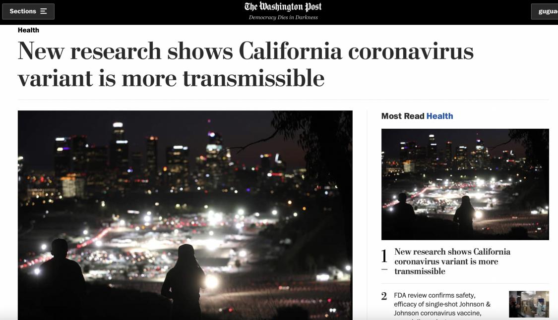 △《华盛顿邮报》报道,新研究显示加州新冠病毒变种更易传播
