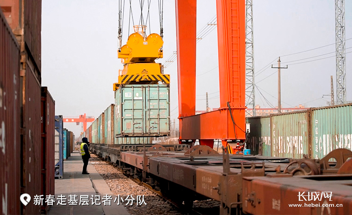 2月2日,伴随着汽笛声,火车驶进冀中南智能港内,停在车辆停靠处。吊车开始加紧作业,将一件件集装箱装载到火车上,里面是满满的货物。