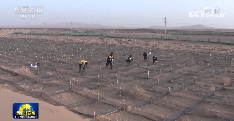 下午治沙工开始制作防沙网格。临策铁路两侧修建了3000万平方米的防沙网格和近1000公里的高沙帐。这是为了有效拦截风沙流沙用的。这几天刮大风,把不少网格吹坏了,治沙工们要尽快修好。