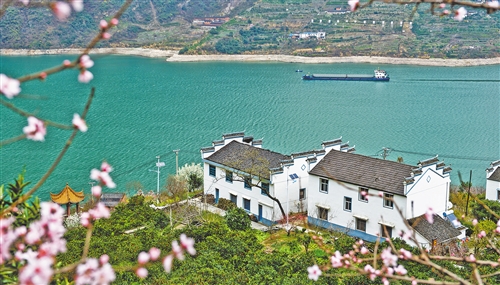 在三峡库区湖北省宜昌市秭归县屈原镇西陵峡村,脐橙园里鲜花盛开。(新华社发)