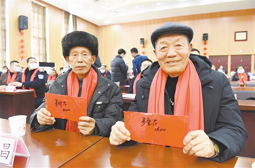 安徽省滁州市凤阳县小岗村,“大包干”带头人严金昌(右)和严付昌展示自家领取的集体经济收益股权分红。(新华社发)