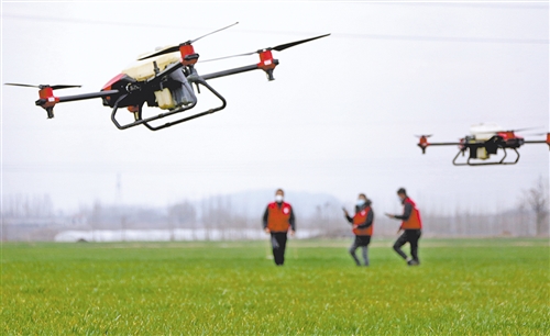 在山东省枣庄市野岗埠村,工作人员使用植保无人机在麦田里喷洒除草剂。(新华社发)