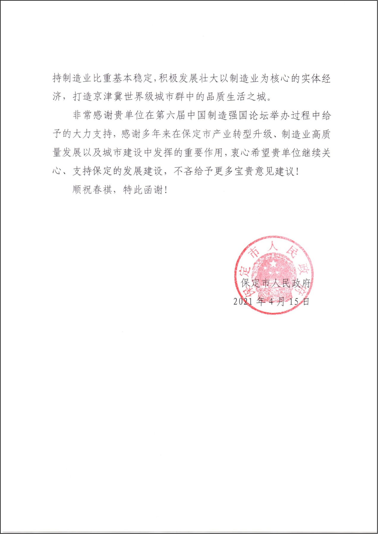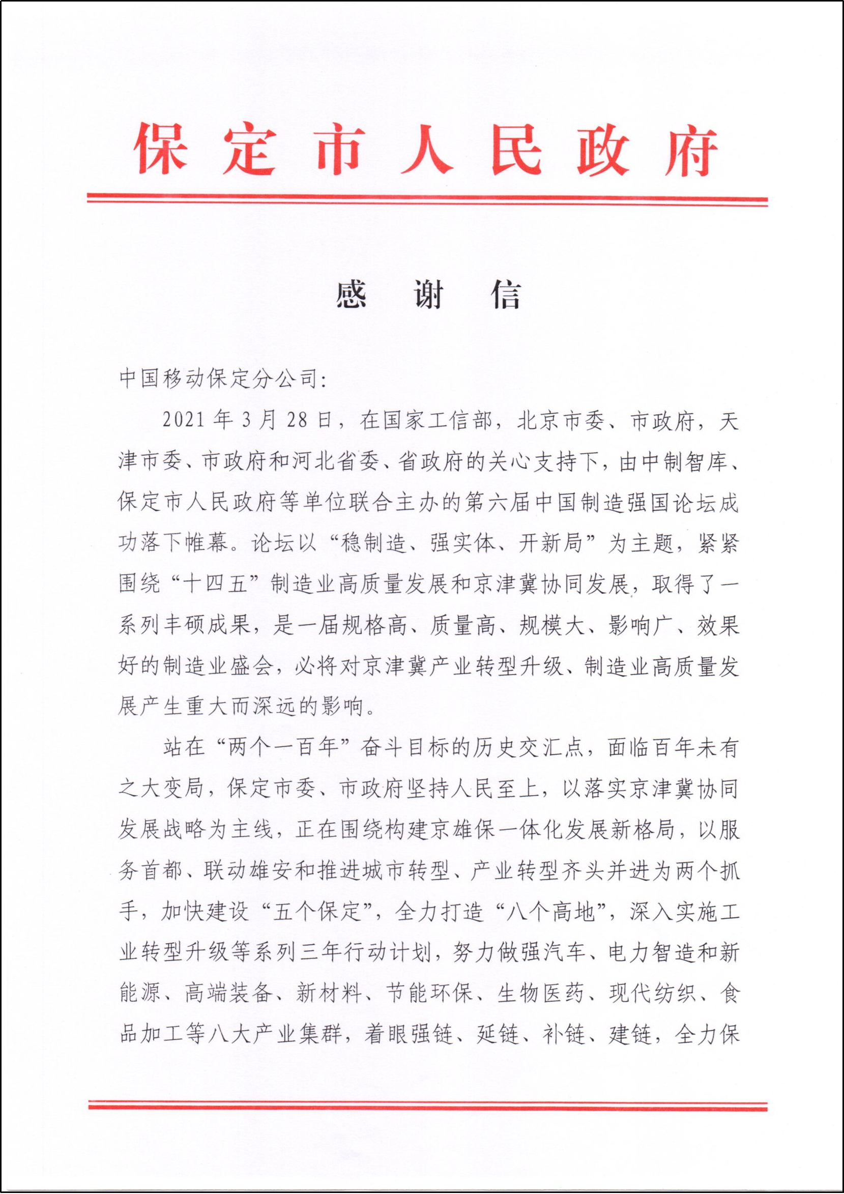 近日,保定移动收到保定市人民政府的感谢信,对第六届中国制造强国论坛期间,保定移动的大力支持给予充分肯定。