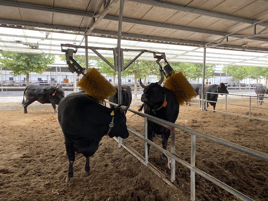 山东省淄博市高青县黑牛小镇里带数字项圈听音乐享受按摩的黑牛(淄博市委网信办供图)